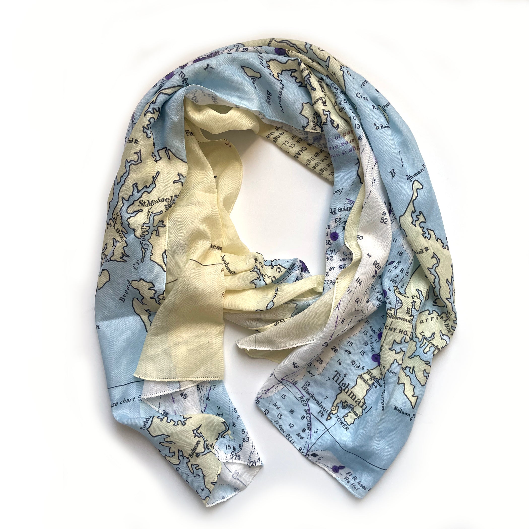 Celebrate the timeless beauty of Maryland and Virginia’s coastal gem with our Chesapeake Bay Nautical Chart Scarf, featuring a stunning vintage Chessa coastal map highlighting the Northern Neck, Annapolis, and St. Michaels. This scarf is the perfect option for anyone seeking non-cheesy Chesapeake Bay souvenirs and wedding gifts that capture the essence of the bay’s rich maritime heritage.