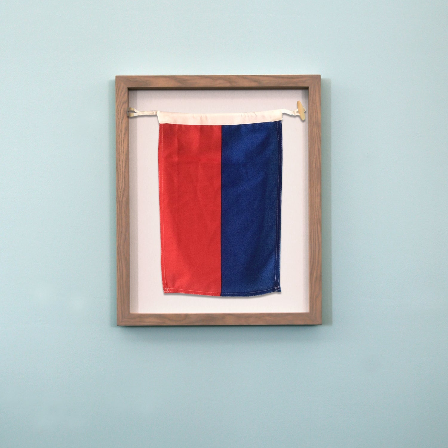 E - ECHO flag framed in a beautifully elegant 'glassless' shadow box. Outer dimensions of frame are 17" wide x 21" high x 1.5" thick. Weighing in at three and a half pounds, this is a substantial art piece honoring our maritime heritage.
