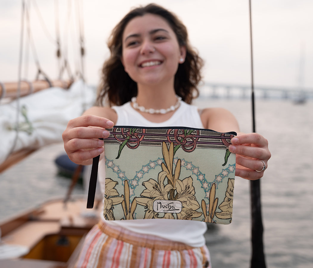 From casual sails to elegant evenings, this Mucha wristlet brings a graceful, vintage touch to your modern routine.