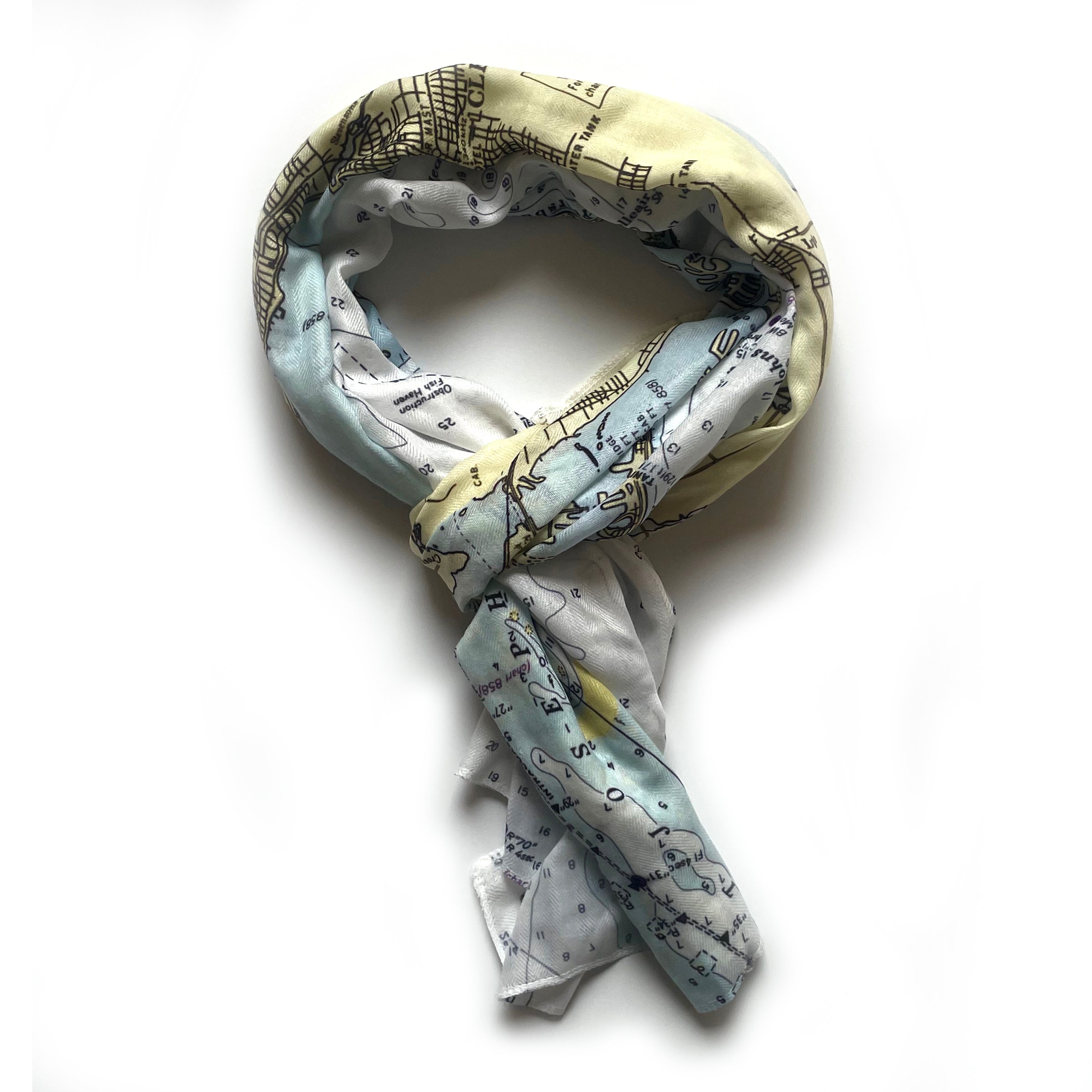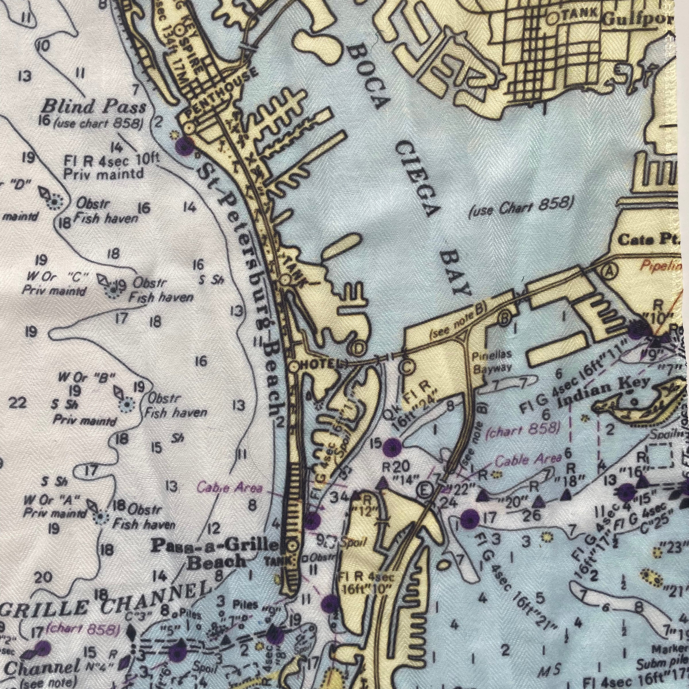 Celebrate the sun-kissed charm of Florida’s Gulf Coast with our St. Pete Beach, Clearwater Vintage Chart Scarf, a thoughtful and stylish wedding gift, honeymoon gift, or anniversary travel gift. This beautifully detailed scarf showcases a vintage-style nautical chart of St. Pete Beach, Clearwater, and the surrounding waters.